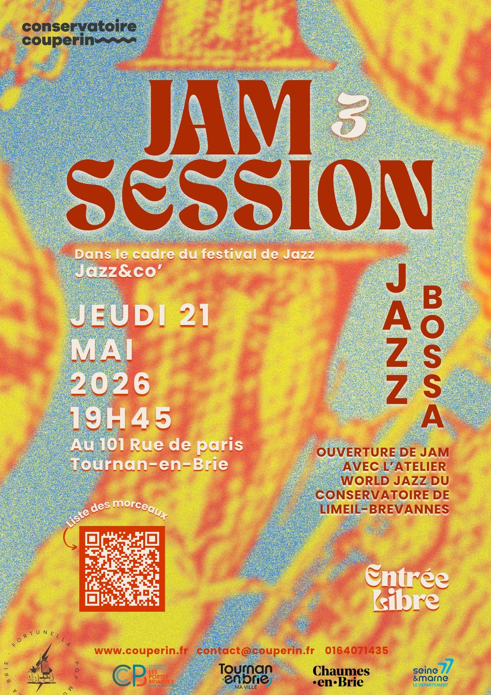 Bonjour à tous·tes, La deuxième Jam, thème année 80, arrive ! Retrouvez en première partie les Djaklines, duo d’Héloïse Lenoir et de Bénédicte Lobato. Rendez-vous le jeudi 19 mars à partir de 19h45 au 101 Rue de Paris à Tournan-en-Brie ! Voici un lien vers les morceaux choisis à travailler pour participer : https://drive.google.com/drive/folders/1rG7N2aY72TpQOj703ISbPzOHr2JP07nm?usp=drive_link Vous y trouverez les paroles, les grilles des morceaux et quelques clefs pour pouvoir éventuellement improviser dessus. Le thème de cette jam se porte sur les années 80 et dans presque tous les morceaux, vous trouverez des éléments d'arrangement qui peuvent être intéressant à relever et jouer, tout ça étant bien entendu interchangeable (mélodie de guitare jouée par un violon, chœurs joués par des soufflants...). C'est le moment de laisser parler votre imagination. Après avoir joué les morceaux choisis, on enchaine sur une jam traditionnelle où tout le monde peut participer en proposant des morceaux de dernière minute ! Entrée libre, fromages et boissons garantis !